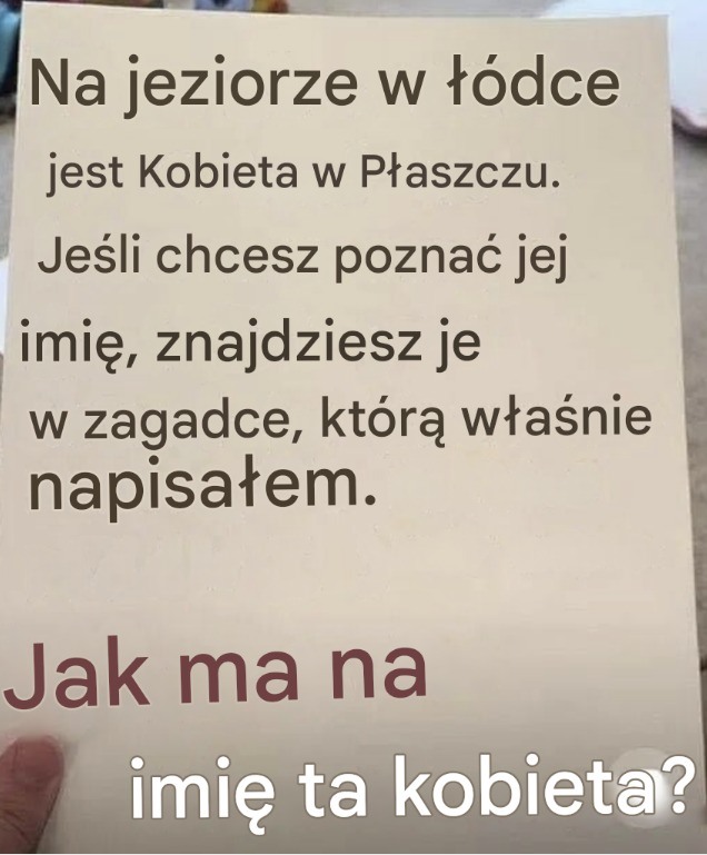 Kobieta siedzi w łódce. Spogląda w dół i podnosi kartkę papieru. Jest na niej imię. Uśmiecha się, bo to właśnie była odpowiedź, której szukała. Jak to imię?